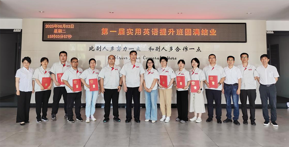 2025年6月3日,天津新立中合金集團有限公司第一屆實用英語提升班(Practical English Improvement,簡稱PEI)結業典禮順利舉行。經過為期一年多的系統培訓,來自各部門的9名學員經過多重考核全部順利結業,其中銷售部趙金瑋、管理部范躍、技術質量部薛曉蘭三位學員榮獲“優秀學員”稱號。